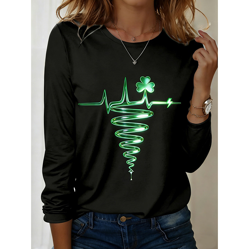 St. Patrick Women's T Shirt Graphic Shamrock Fashion Stylish Classic Long Sleeve Crew Neck Round Neck Regular Tops Daily Weekend Print Black White Green Summer Spring Fall