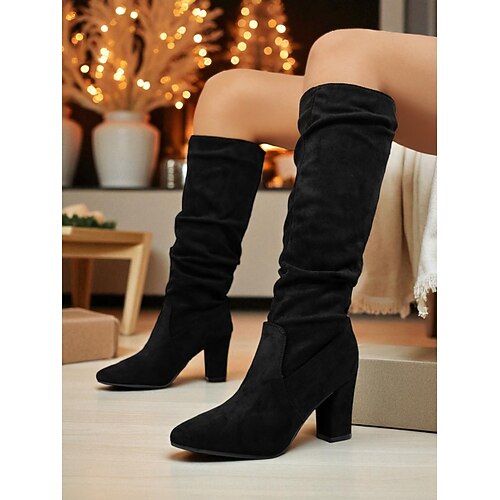 stivali alti fino al ginocchio da donna in similpelle nera con cerniera e fibbia decorativa: eleganti stivali invernali con tacco medio per outfit casual, da lavoro e da vacanza