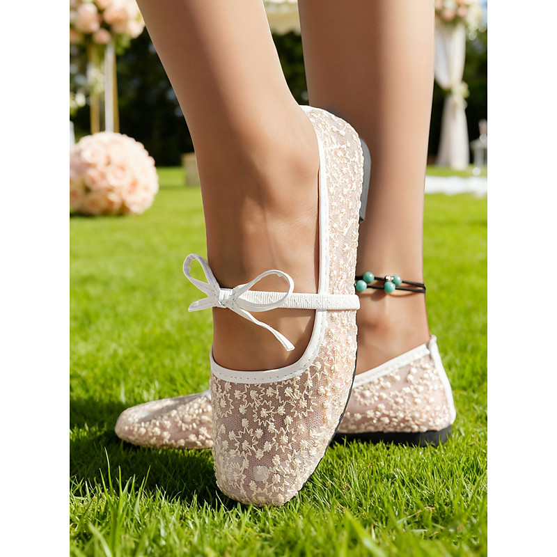 Women's Daily Outdoor Garden Wedding Flat Heel Pointed Toe Fashion Lace Elastic Band Black White