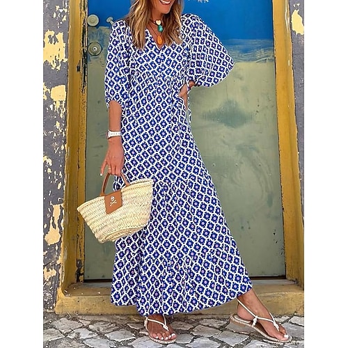 Damen-Jeanskleid in Übergröße mit Kurven, Freizeitkleid, Etuikleid, einfarbig, langes Kleid, Maxikleid, 3/4-Ärmel, Knopf, V-Ausschnitt, modisch, täglich, Blau, Sommer, Frühling, L, XL, XXL, 3XL, 4XL