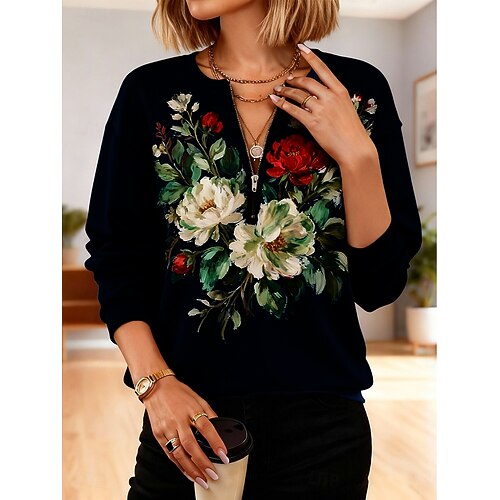 Per donna Felpa Pullover Felpe con cerniera Floreale Moda Casual Manica Lunga Girocollo Top Regolari Streetwear Abbigliamento Quotidiano Casuale Cerniera Stampato Nero Blu marino Viola Primavera