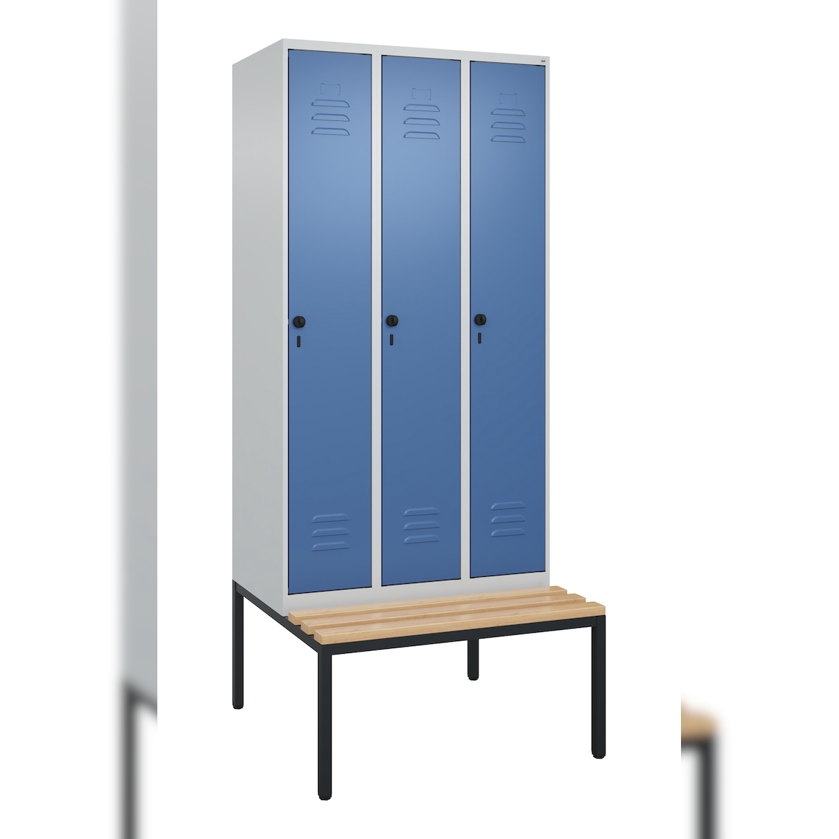 Z-Spind Classic PLUS Sitzbank, 3 Abteile, lichtgrau / lichtblau, B 900 mm, Zylinderschloss, auskragend, Buche-Hartholz C+P