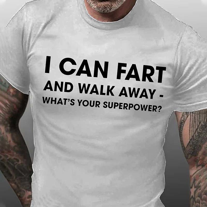 Men's Funny Graphic T-Shirt: 'I Can Fart And Walk Away - What's Your Superpower?' Short Sleeve Humor Tee for Lifestyle Gag Gifts