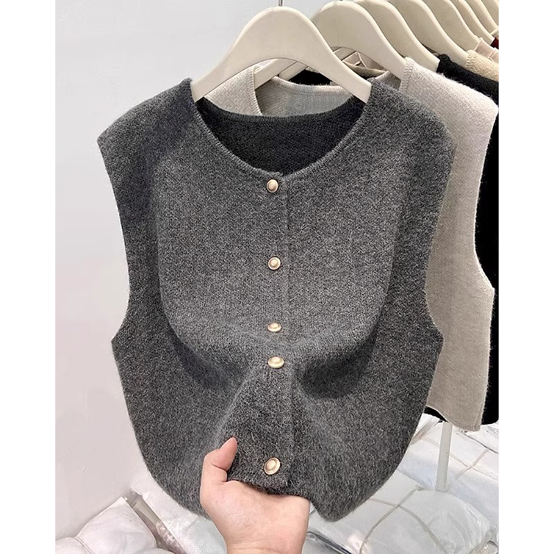 Women's Sweater Sweater Vest Streetwear Casual Solid Color Crew Neck Buttons Knitted Sleeveless Regular Tops Knit Daily Holiday Weekend Black Apricot Fall Winter