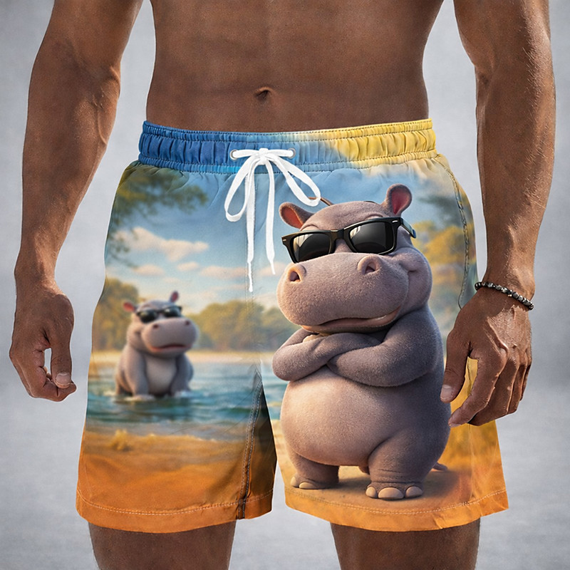 Men's Cartoon Elephant Hippopotamus Swim Trunks Swim Shorts Board Shorts Mid Waist Funny Hawaiian Beach Vacation Wear Side Pockets Mesh Lining Elastic Drawstring Waist Designer Clothing Apparel