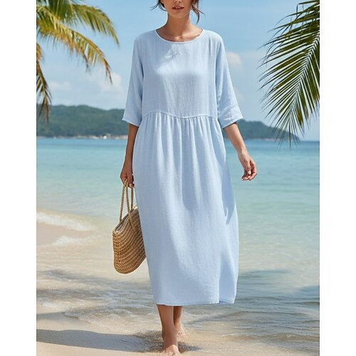 Per donna Abito Midi 100% cotone Abito a Tubino Vestito a caftano Vestito Casual Moda Essenziale Classico Quotidiano Spiaggia Weekend Vestibilità regolare Semplice Mezza Manica Girocollo Bianco Rosa