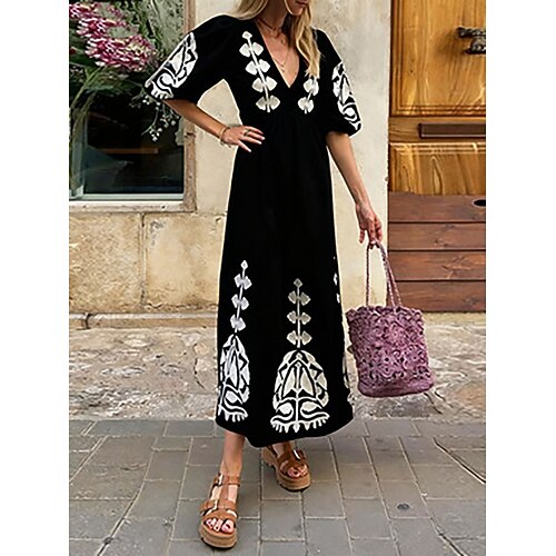 Per donna Abito Midi Finto cotone e lino Vestito a caftano Vestito Casual Abito Stampato Elegante Moda Moderno All'aperto Vacanza Uscire Vestibilità comoda Geometrico Mezza Manica Scollo a V Nero