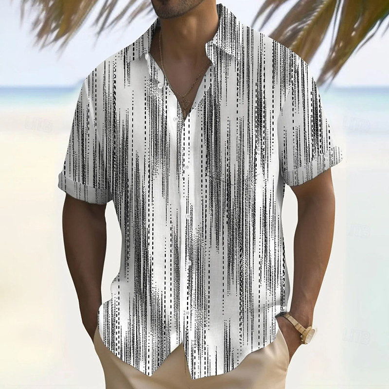 Men's Geometric Striped Shirt Summer Shirt Button Up Shirt Short Sleeve Fashion Casual Vacation Holiday Streetwear Summer Turndown 3D Print Front One Pocket Linen Like Shirt Gray