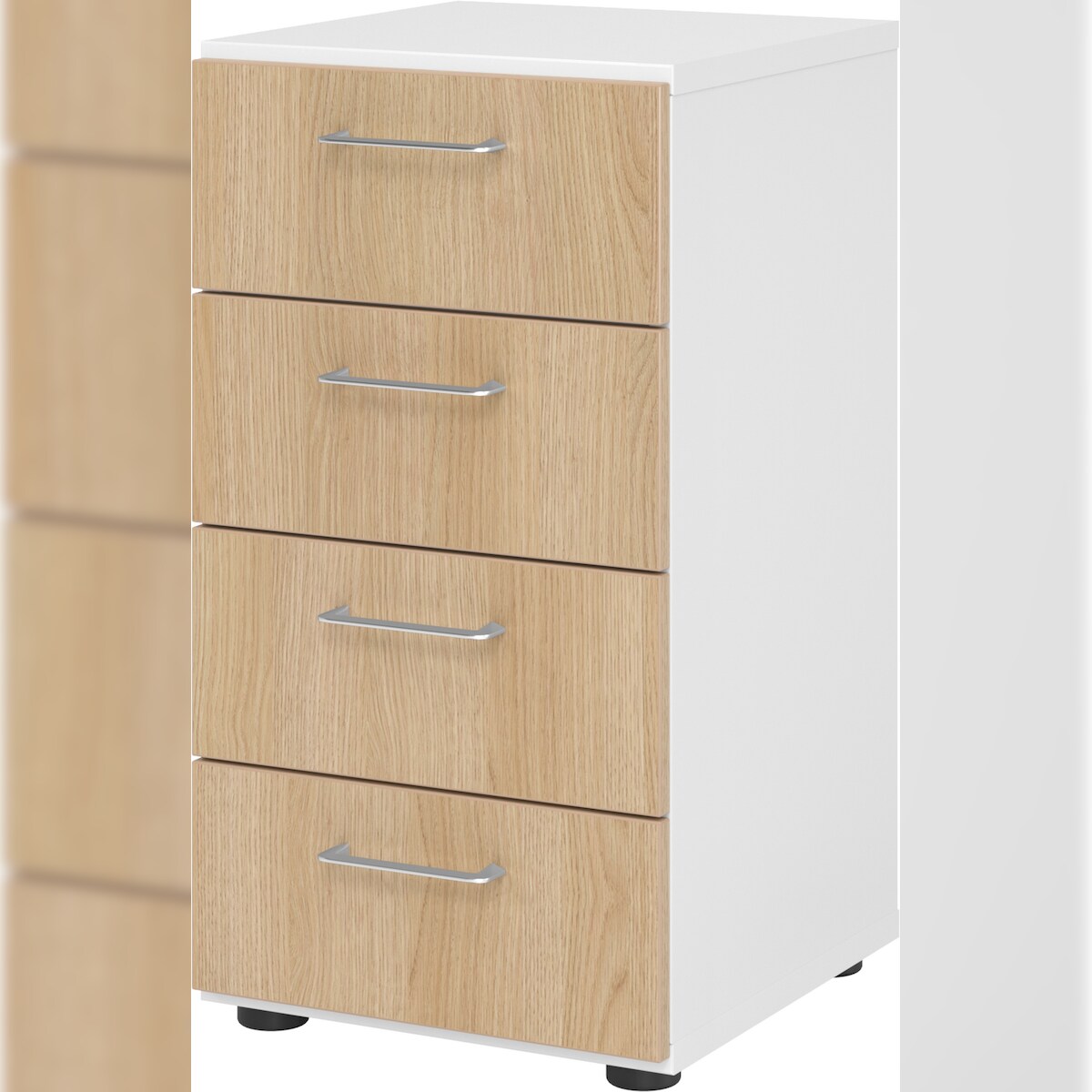 bümö smart Schubladenschrank, Büroschrank in Weiß/Eiche mit 4 Schüben - Bürocontainer aus Holz, Container mit Metallgriffen & Soft-Stop Schubladen