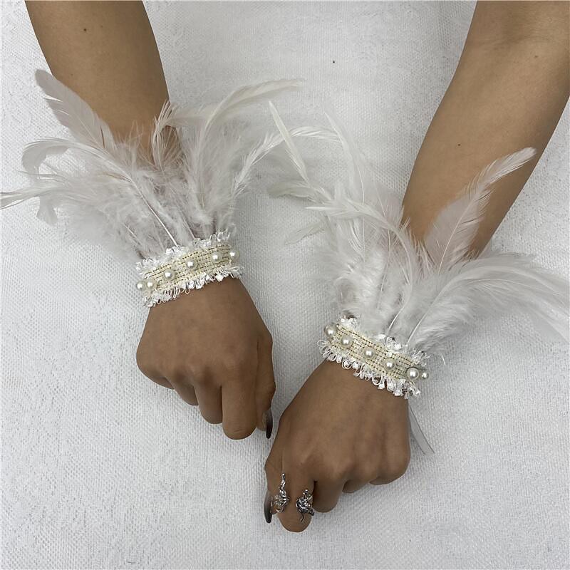 Carnival 2026Rio Carnival Samba Accessories Women's Green Feather Wrist Cuffs with White Pearl Lace Brazil Festival Performance Costume