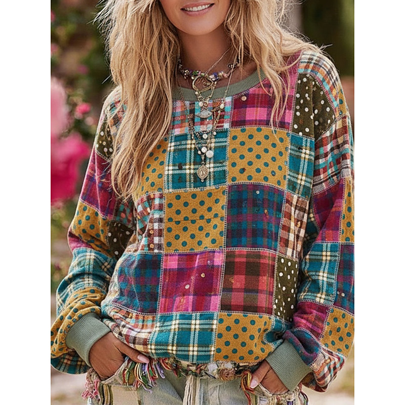 Women's Pullover Hoodies Floral Plaid Vintage Streetwear Casual Long Sleeve Crew Neck Hooded Regular Tops Dailywear Casual Drawstring Patchwork Print Yellow Spring Fall