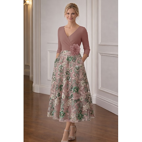 Linea ad A Lunghezza alla caviglia Lunghezza Tè Vestito da Festa Abito da Cocktail Abito da invitata a nozze Abito da cerimonia per signora Manica 3/4 Scollo a V Elegante Vintage Formale Cocktail