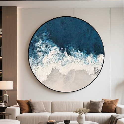 Rahmengemälde, handgefertigtes 3D-Ölgemälde mit Ozeanwellen, kreisförmige Wandkunst mit lebendiger Farbpalette, satten Blautönen und komplizierten Pinselstrichen, die eine mehrschichtige Textur für