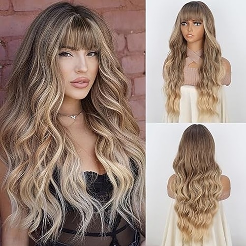 Perücke mit Pony, lange, gewellte Perücken mit dunklem Ansatz, natürlich aussehende Perücken aus hitzebeständigem Kunsthaar für Frauen, für den täglichen Gebrauch auf Partys und im Urlaub