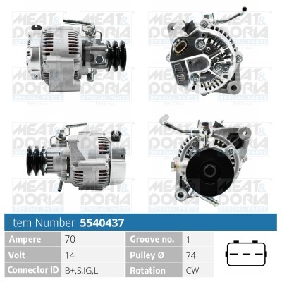 Laturi 14V 70A Meat & doria 5540437 - toyota hiace buss iv, hiace skåp iv, hilux pick-up vi - OE 221005D180, 27040-54280, 27040-54300