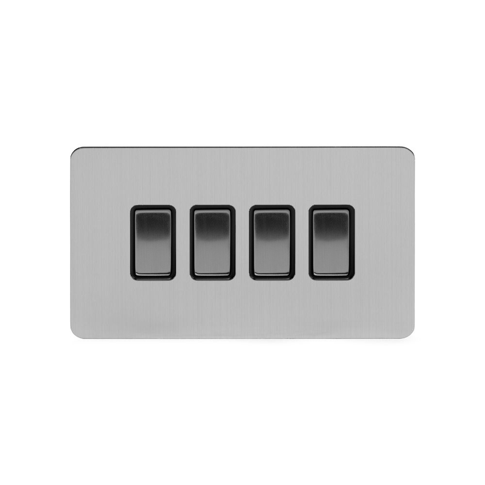 Soho Lighting Brushed Chrome Flat Plate 4 Gang Switch With 1 Intermediate (3 x 2 Way Switch with 1 Intermediate) Blk Ins Screwless - Size: H 86mm X W