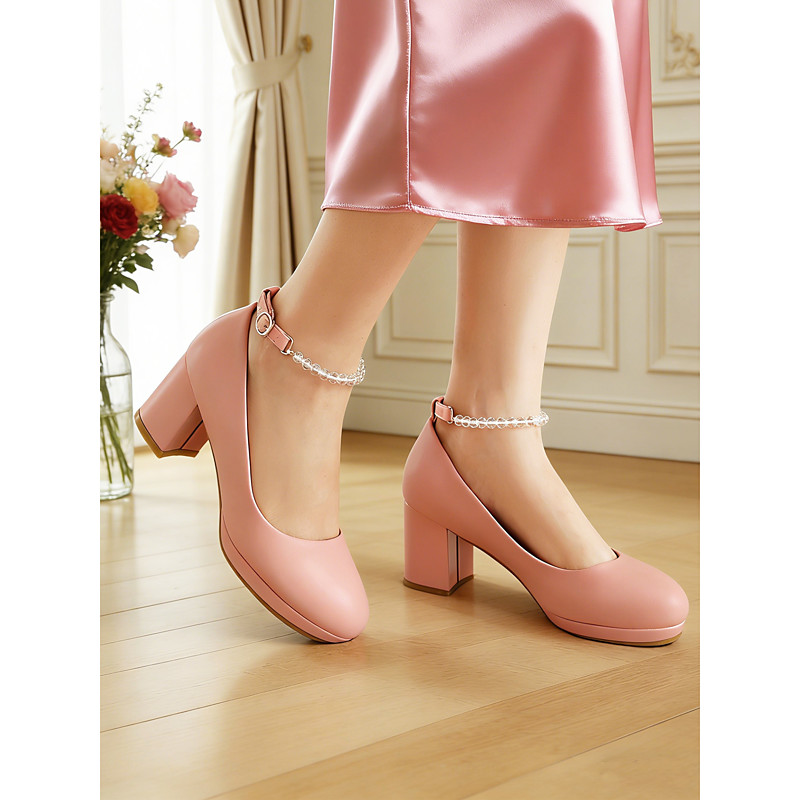 Women's Pink Block Heel Pumps with Ankle Strap – 1950s Vintage Elegant Mary Jane Style, Comfortable Round Toe Heels for Retro Lovers, Weddings, Parties and Formal Occasions