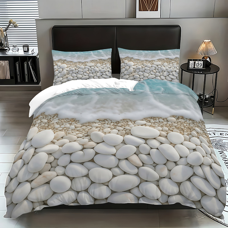 Beach Pebble Print 3-Piece Down Duvet Cover Set for Queen Bed, Soft Comforter Cover with 2 Pillowcases – Hotel Guest Room Bedding, Cozy Comfortable