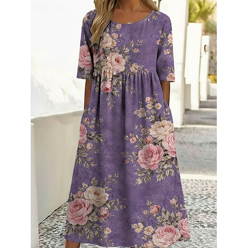 Per donna Abito Midi Vestito Casual Abito Stampato Vintage All'aperto Vacanza Uscire Vestibilità comoda Floreale Grafico Mezza Manica Girocollo Blu Viola chiaro Viola Verde Estate Primavera