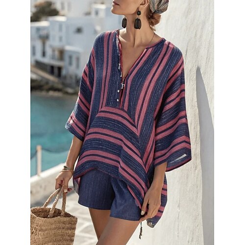 Per donna Set di Pantaloncini Finto cotone e lino Manica 3/4 Scollo a V A righe Vacanza Quotidiano Casuale Quotidiano All'aperto Viola Cachi Beige Estate Vestibilità comoda