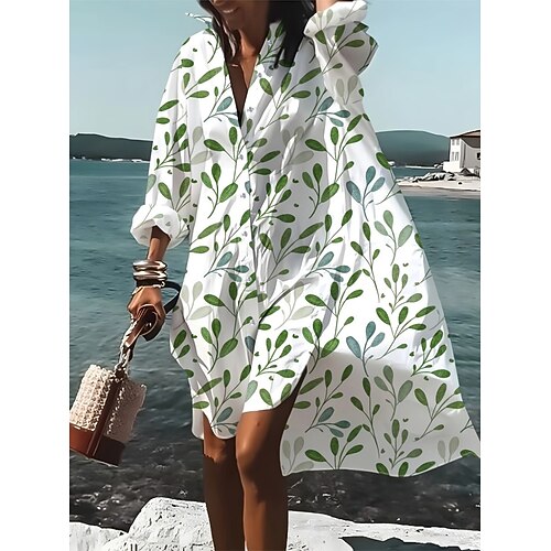 Per donna Abito al ginocchio Abito Camicia Vestito Casual Abito Estivo Elegante Bohemien Vacanza Spiaggia Vestibilità comoda Floreale Manica Lunga Scollo a V Colletto a Camicia Blu Giallo Verde