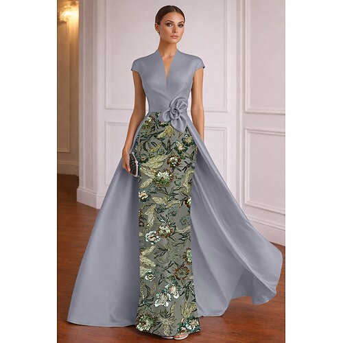 Linea ad A Tubino Colonna Lunghezza al pavimento Abito da Sera Abito da ballo con sopragonna Elegante Scintillante Floreale Manica Corta Scollo a V Festa serale Festa in giardino Raso Shiena scoperta