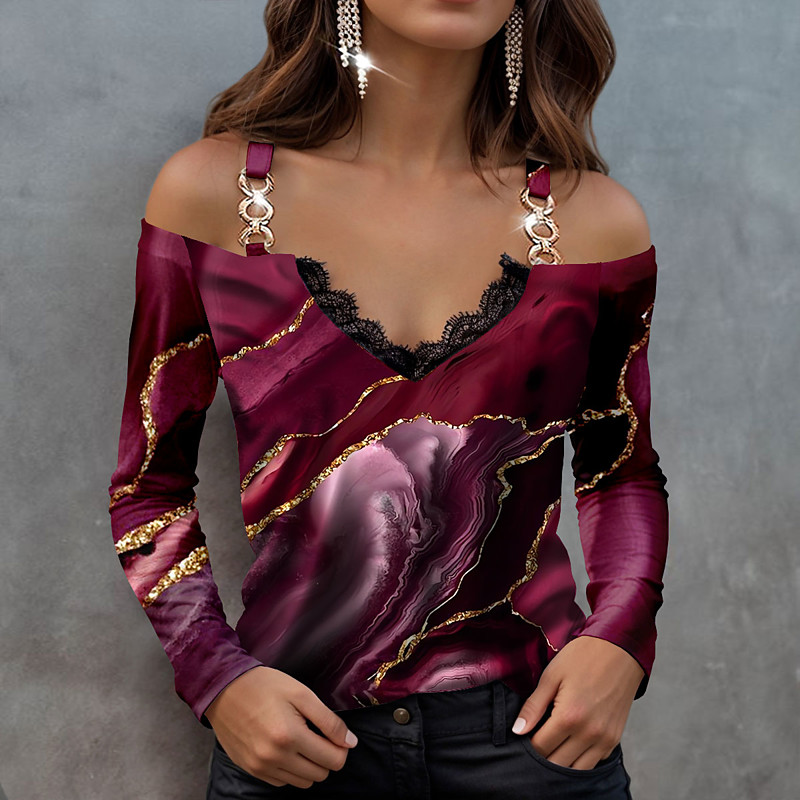 Women's Blouse Long Sleeve V Neck Fashion Abstract Print Cold Shoulder Regular Tops Casual Red Blue Green Spring Fall