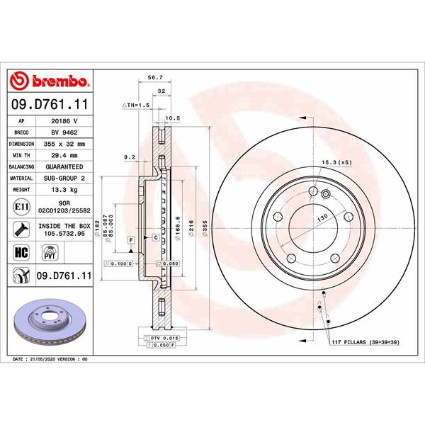 Jarrulevy Tuuletettu, Etuakseli Brembo 09.D761.11 - mercedes-benz g-klass [w463] - OE 4634210000, 4634211200, A4634210000