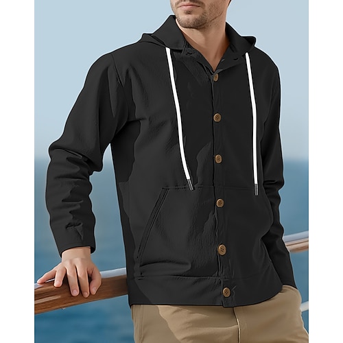 Per uomo Camicia Camicia di lino Camicia Estiva Camicia da Spiaggia Semplice Vacanza Casuale Nero Bianco Blu marino Cachi Manica Lunga Con Cappuccio Primavera Autunno Abbigliamento Coulisse