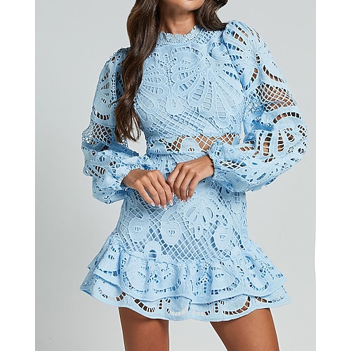 Per donna Mini Abito Abito nero Abito in Pizzo Abito ritagliato Tubino Moda Moderno Manica a rete Manica a Lanterna Ufficio Uscire Vestibilità regolare Floreale Manica Lunga Collo alla coreana Blu