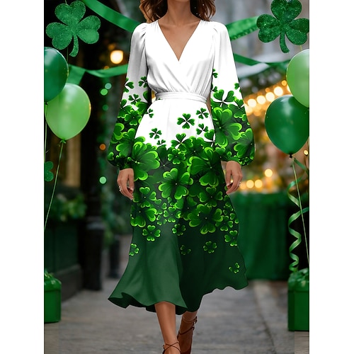 Abito midi da donna per la festa di San Patrizio, abito a trapezio, casual, quotidiano, per le vacanze, vestibilità regolare, con motivo grafico a trifoglio, manica lunga, scollo a V, bianco, verde,