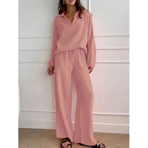 set da donna in cotone, set di pantaloni in 100% cotone, manica lunga, colletto della camicia, tinta unita, coulisse, elegante, moda, streetwear, casual, quotidiano, all'aperto, nero, bianco, rosa,