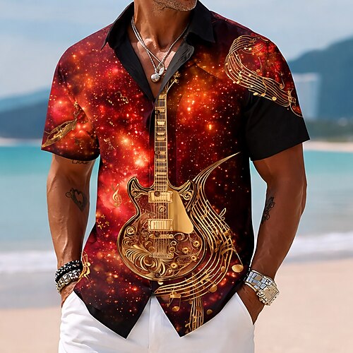 Herren Sternenklarer Himmel Gitarre Musikinstrument Hemd Knopfhemd Kurzarm Künstlerisch Vintage-Retro Musikfestival Ferien Sommer Frühling Umlegekragen 3D-Druck Hemden mit Kragen Rote Purpur Braun