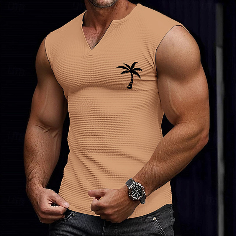 Men's Waffle Shirt Tank Top Undershirt Sleeveless Shirt Sleeveless V Neck Summer Coconut Tree Fashion Designer Muscle Print Outdoor Gym Going out Black White Yellow Top Tee for Men