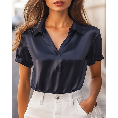 camicetta estiva in raso da donna, top eleganti, tinta unita, semplici, eleganti, vintage, da donna, maniche corte, colletto, top normali, da lavoro quotidiano, per uscire, arricciati, patchwork, bottoni, blu reale, estate, primavera