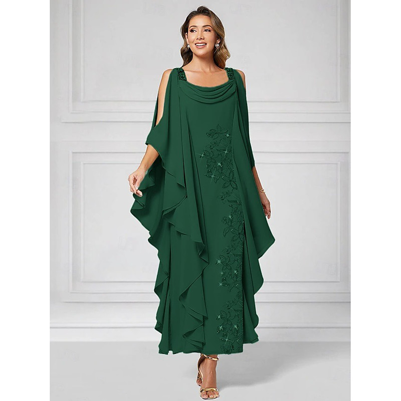 Sheath Column Ankle Length Party Dress Cocktail Dress Wedding Guest Dress Mother of the Bride Dress Half Sleeve Boat Neck Elegant Luxurious Sparkle Shine Wedding Guest Chiffon with Beading Tier