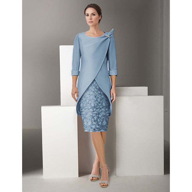 Two Piece Sheath Column Dress Sets Knee Length Wedding Guest Dress Mother of the Bride Dress 3/4 Length Sleeve V Neck Elegant Vintage Sparkle Shine Wedding Party Semi Formal Satin Glitter Lace with