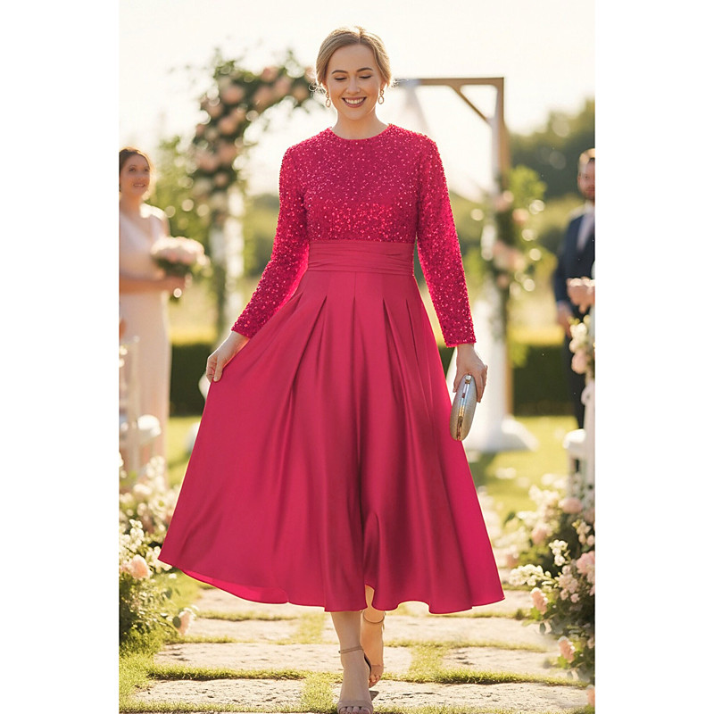 A-Line Ankle Length Tea Length Party Dress Cocktail Dress Wedding Guest Dress Mother of the Bride Dress Long Sleeve Crew Neck Elegant Sparkle Shine Formal Wedding Guest Satin Sequined with Pleats