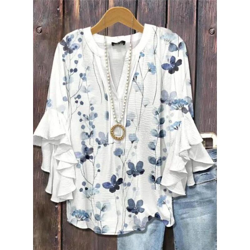 Women's Blouse V Neck Layered Ruffle Sleeve Tops Floral Graphic Striped Daily Stylish Casual 3/4 Length Sleeve Regular Tops Daily Holiday Vacation Wear Print White Blue Sky Blue Orange Green Summer