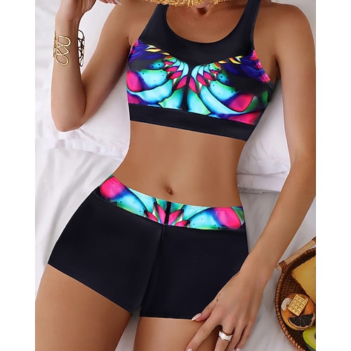 Costume da bagno a due pezzi da donna tankini palma vita alta attivo vacanza con grafica floreale scollatura tonda senza maniche
