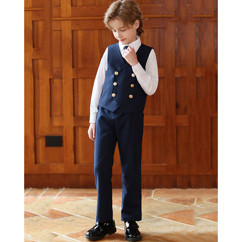 4 Pieces Ring Bearer Suit Boys' Kids Suit Vest Shirt Pants Boy's Formal Suit Casual Outdoor Party Fashion Cool Basic Solid Color Pocket Buttons Navy Blue Gray Polyester
