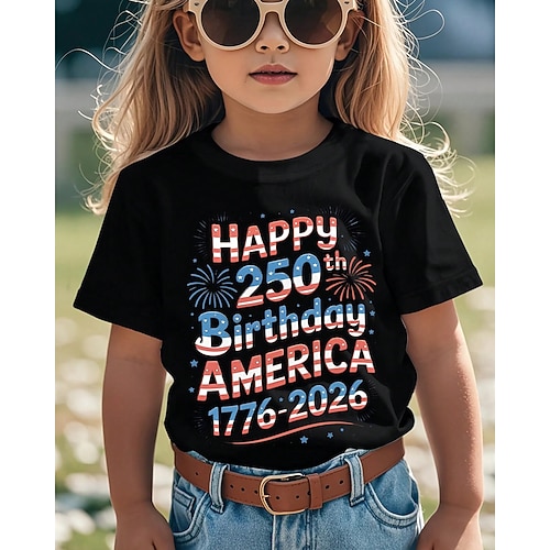 100% Cotone Bambini Ragazze Nero Bianco Grafico 250° anniversario Bandiera americana per bambini Maglietta Girocollo Manica Corta Vacanza Sport Outdoor Abbigliamento Quotidiano Casual Stampa Estate