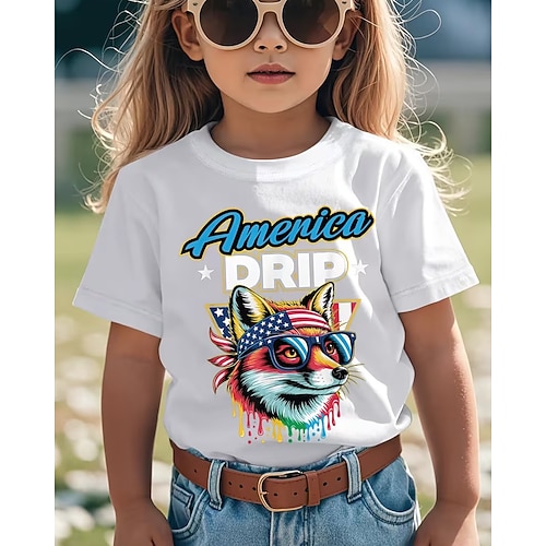 Cotone 100% Cotone Bambini Ragazze Nero Bianco Grafico Volpe 250° anniversario Bandiera americana per bambini Maglietta Girocollo Manica Corta Vacanza Sport Outdoor Abbigliamento Quotidiano Attivo
