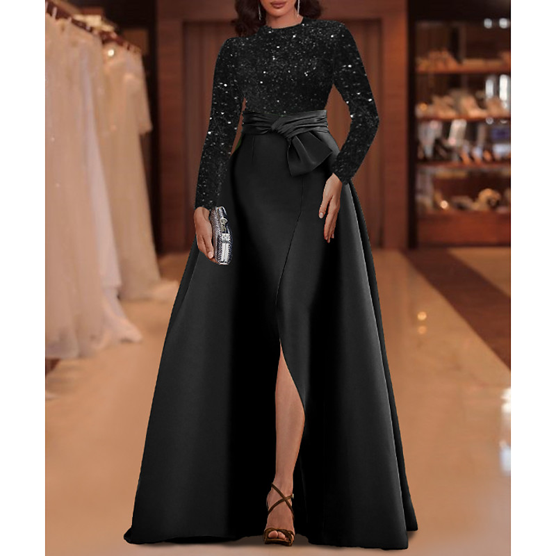 A-Line Floor Length Evening Gown Ball Gown Formal Dress Elegant Glittering Silky Long Sleeve Crew Neck Wedding Formal Pocket Sequined with Glitter