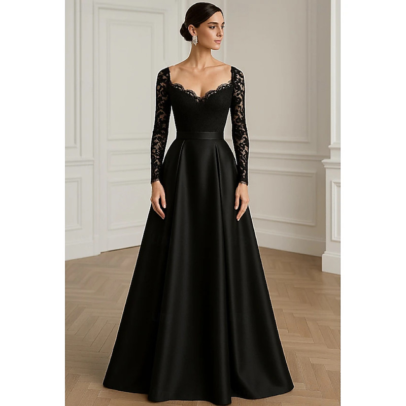 A-Line Floor Length Evening Gown Ball Gown Formal Dress Elegant Silky Long Sleeve V Neck Wedding Formal Pocket Satin Lace with Glitter