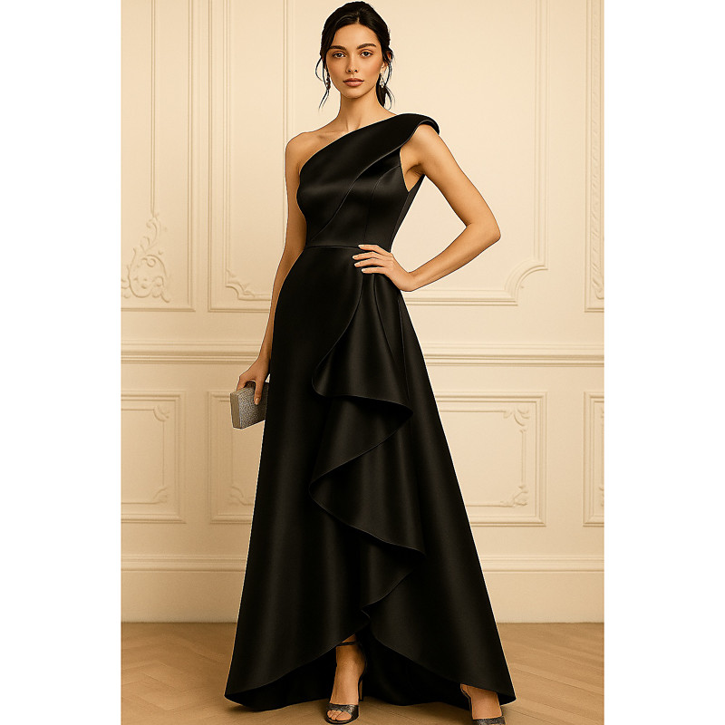 A-Line Floor Length Evening Gown Ball Gown Formal Dress Elegant Sleeveless One Shoulder Wedding Formal Pocket Satin with Ruched Ruffles