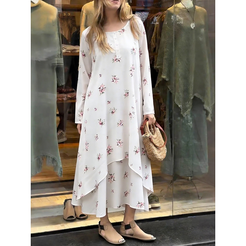 Women's Midi Dress Shift Dress A Line Dress Casual Holiday Loose Fit Floral Graphic Long Sleeve Crew Neck White Yellow Brown Green Summer Spring Fall Winter