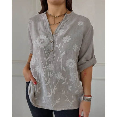 Per donna Camicia Top Eleganti Floreale Grafico Semplice Elegante Signore Classico Manica Lunga Scollo a V Top Regolari Lavoro Quotidiano Ferie Bottoni Stampato Bianco Cachi Grigio Primavera Autunno