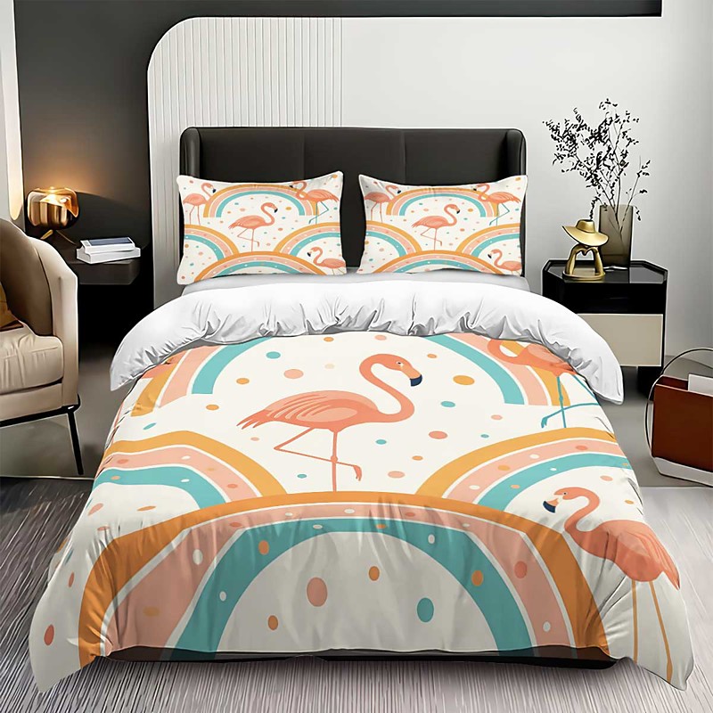 Rainbow Flamingo 3-Piece Down Duvet Cover Set for Queen Bed, Soft Comforter Cover with 2 Pillowcases – Hotel Guest Room Bedding, Cozy Comfortable