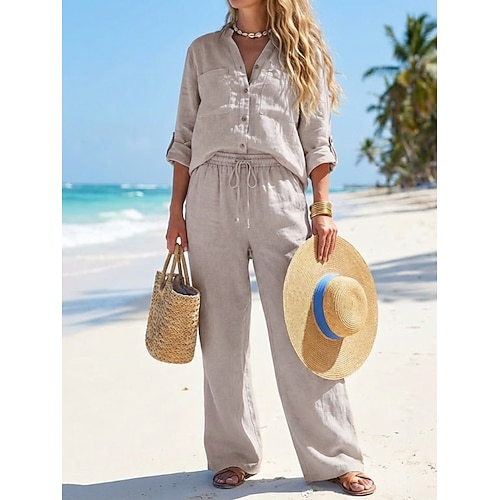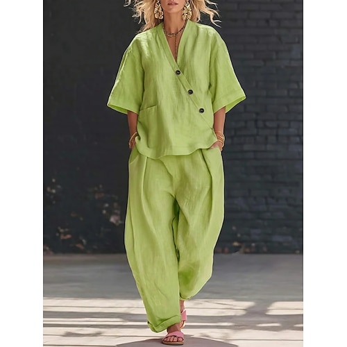 Per donna Set di Pantaloni Finto cotone e lino Manica 3/4 Scollo a V Tinta unica Moda Streetwear Casuale Quotidiano All'aperto Blu Nero Rosa Estate Vestibilità comoda